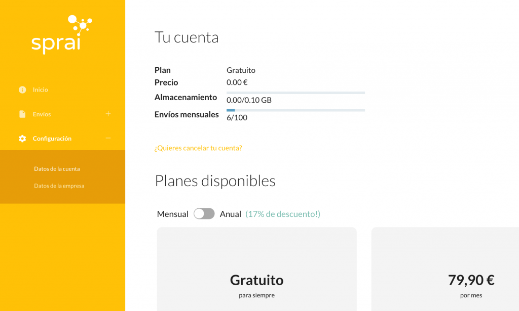 Desde el nuevo apartado de “Configuración” / “Datos de la cuenta” puedes ver el estado actual de tu cuenta: qué plan tienes contratado y cuántos destinatarios y espacio de disco tienes disponible. Desde este mismo apartado puedes modificar cuando tú quieras el plan contratado y, si corresponde, realizar el pago cómodamente con tarjeta de crédito a través de nuestra pasarela de pago seguro.